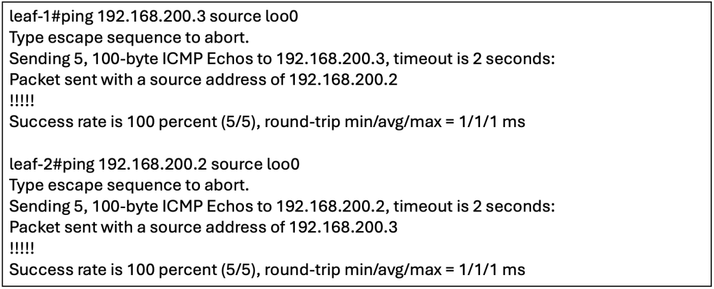 In our configuration above, you might find that both leaf-1 and leaf-2 are both importing and exporting the same RT via the VRF IPv4 address family. This is only the case when we only have a single overlay VRF.