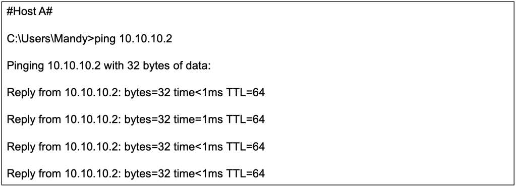 We will now initiate a ping from host A (10.10.10.2/24) to host B (10.10.20.4/24).