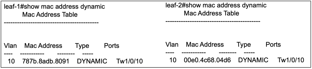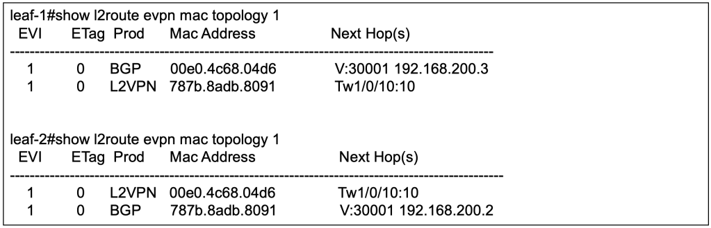 Leaf 1’s BGP EVPN has learnt the IP & MAC binding of the host B behind leaf 2.