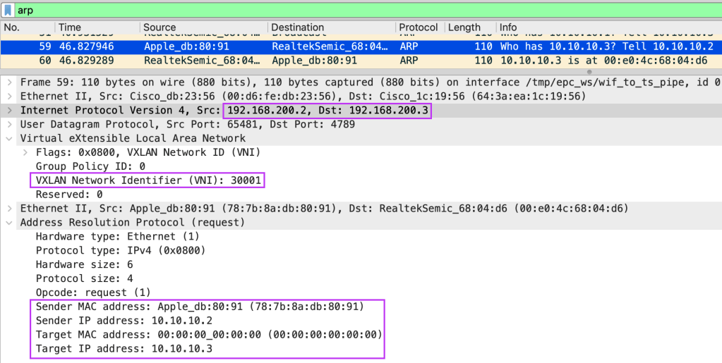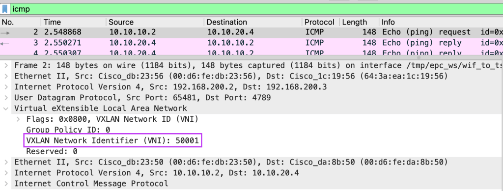 From Wireshark, we can observe that the ICMP echo request between different subnets will use the L3VNI (50001) as both host A and host B are still in the same L3VNI, VRF.