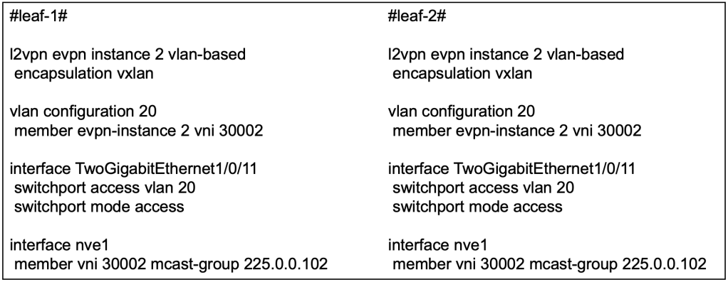 Before we proceed with the most interesting part of today’s topic, we must make sure that we have the L2VNIs setup in both switches. Technically, we only require one unique L2VNI per switch but since we continuing on from previous lab, we already have L2VNI 30001 configured on both switches in the previous article. We shall proceed to configure L2VNI 30002 on both switches as well.
