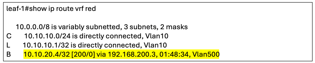 When the BGP updates reaches the VTEPs, the leaf switches will need to decide which of the L2 (EVPN) and L3 (unicast) information to import to its VRF. This is where the RT of L2VNI and L3VNI is important because over at the VRF definition, we will configure which RT to import for unicast prefixes, and to stitch all the EVPN prefixes from all L2VNI associated to the L3VNI (VRF).