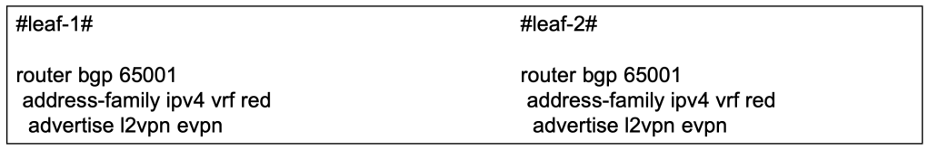 This is important because when we advertise L2VPN EVPN via the BGP IPv4 unicast address-family for VRF (red), the BGP protocol is taking the learnings from the EVPN and into the IPv4 unicast address-family. Assuming the EVPN information, now riding on IPv4 unicast address-family reaches the destination VTEP, it is up to the VTEP to decide if it will import the prefixes. Hence, this means that the VRF definition on the VTEP needs to import the RT of the L2VNIs that are part of the L3VNI (VRF).